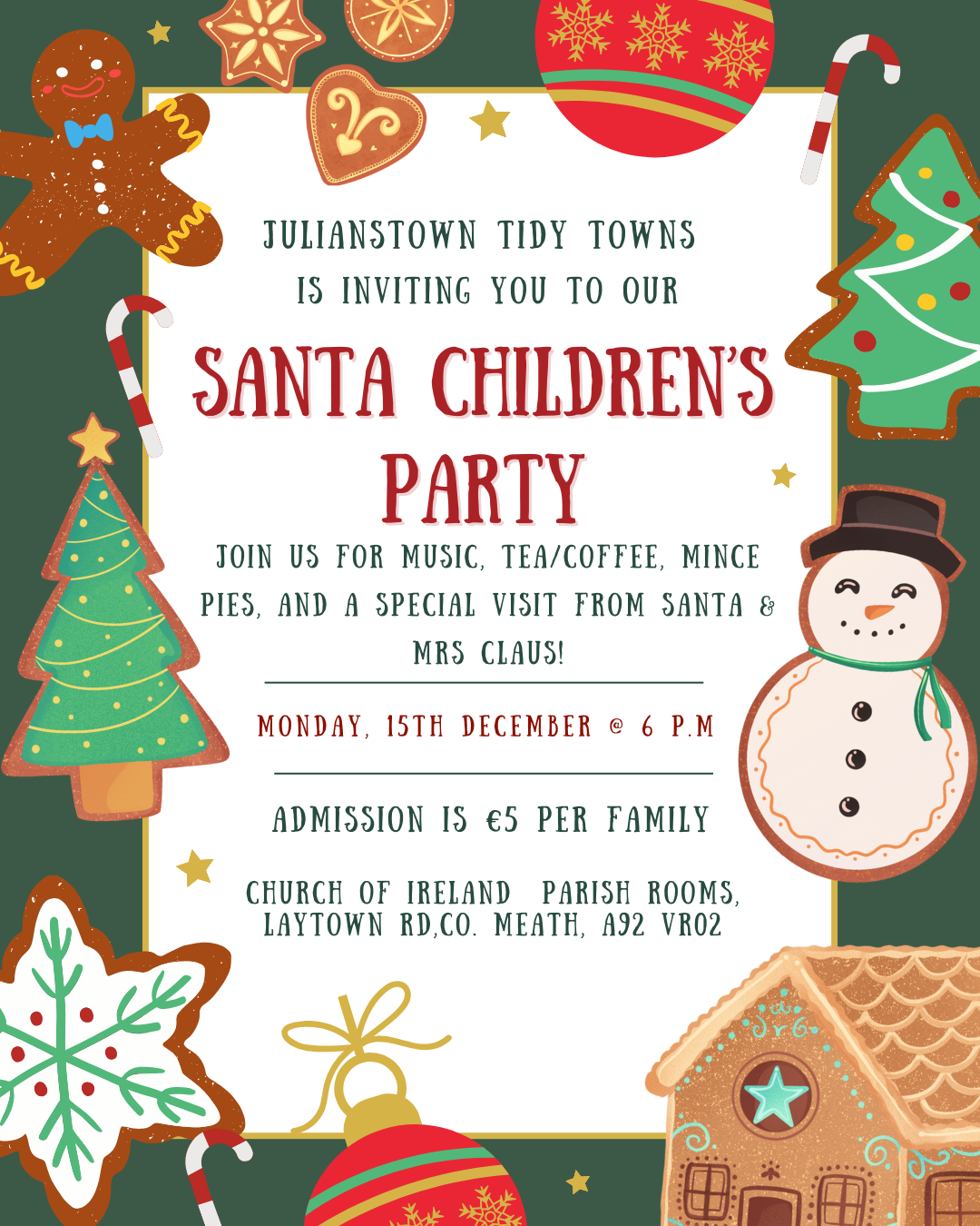 This event is being run by Julianstown Tidy Towns and we thank St. Mary's Church of Ireland on the Laytown Road for hosting the event. Admission is €5 per family which includes Tea/Coffee and mince pies. Super Raffle on the Night! We hope you will dig deep into your pockets as we are hoping to raise funds for projects in the New Year for Julianstown Village. We thank you and hope to see you all in St. Mary's Parish Rooms and join in the Christmas Carols while waiting for Santa and Mrs. Claus to arrive.