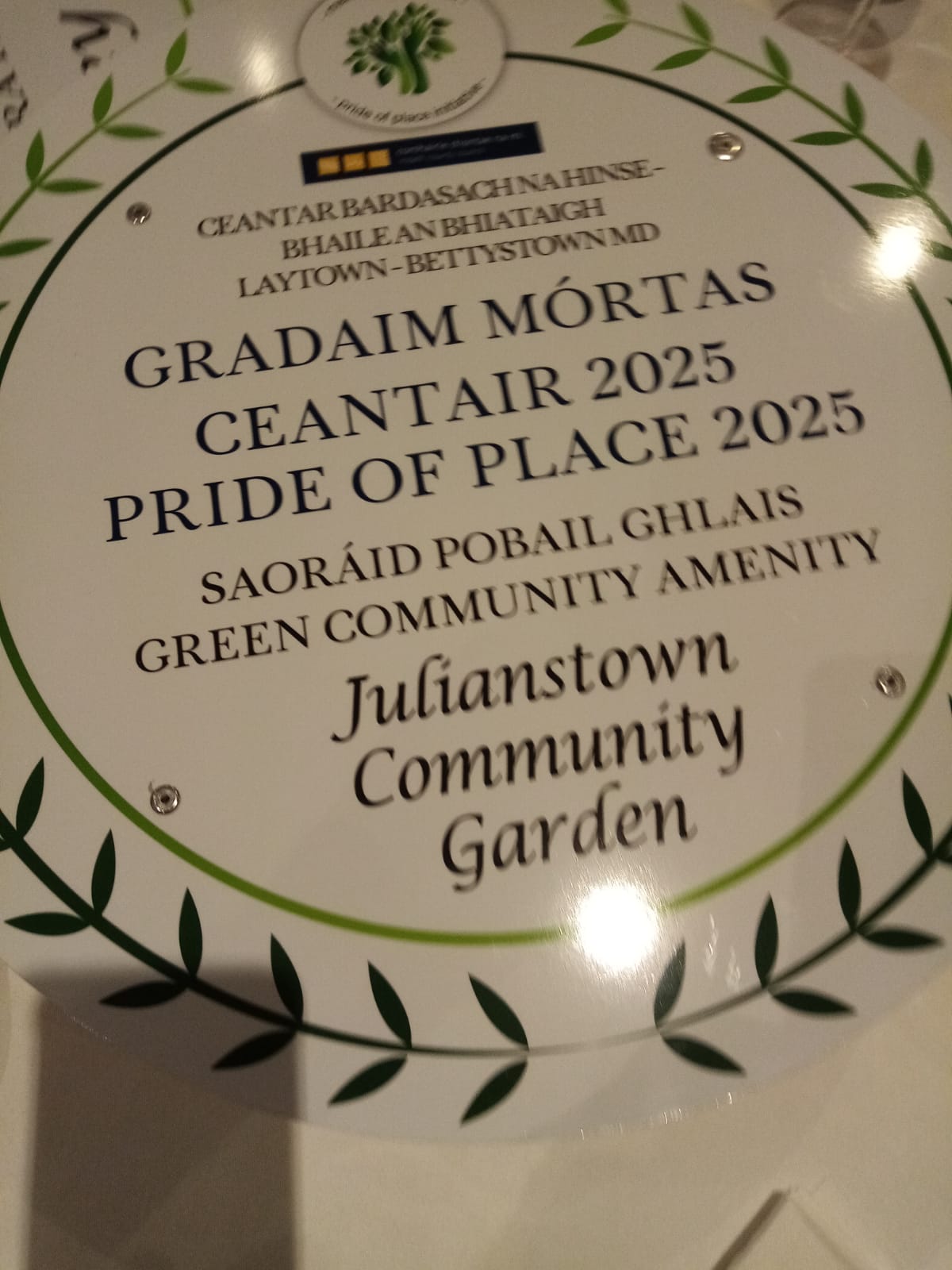 Aisling Monahan, Chairperson of Julianstown & District Community Association would like to thank Kevin, Bob, Omar, Gerard, Paul and Niamh for all their hard work over the past year and beyond. It’s great to be recognised for the work done in the garden. Our garden is a very special space, enjoyed by many and a tribute to the work of so many over the years. Well done and a huge thanks to all of our Volunteers, for your hard work and support of our work in the village, over the past year and beyond. We wouldn’t be anywhere without your dedication. It’s really great to win the plaque for the garden and the village. Well done to Nicola, Deirdre and Brian from Aney View for winning joint first runner up in the small housing estate category. A fantastic achievement which adds to the success of the village. Very enjoyable night in the Glenside courtesy of MCC. Good ideas and plans for next year!!!